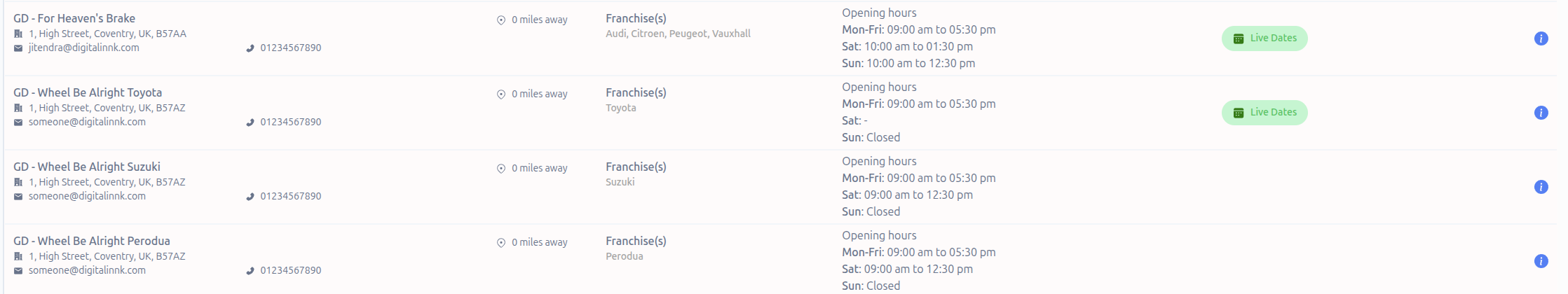 When users are creating a booking and viewing the list of suppliers, those with DMS integration are identified by a 'Live Dates' tag. This indicator helps users quickly identify suppliers whose availability is synchronized in real-time with their DMS.