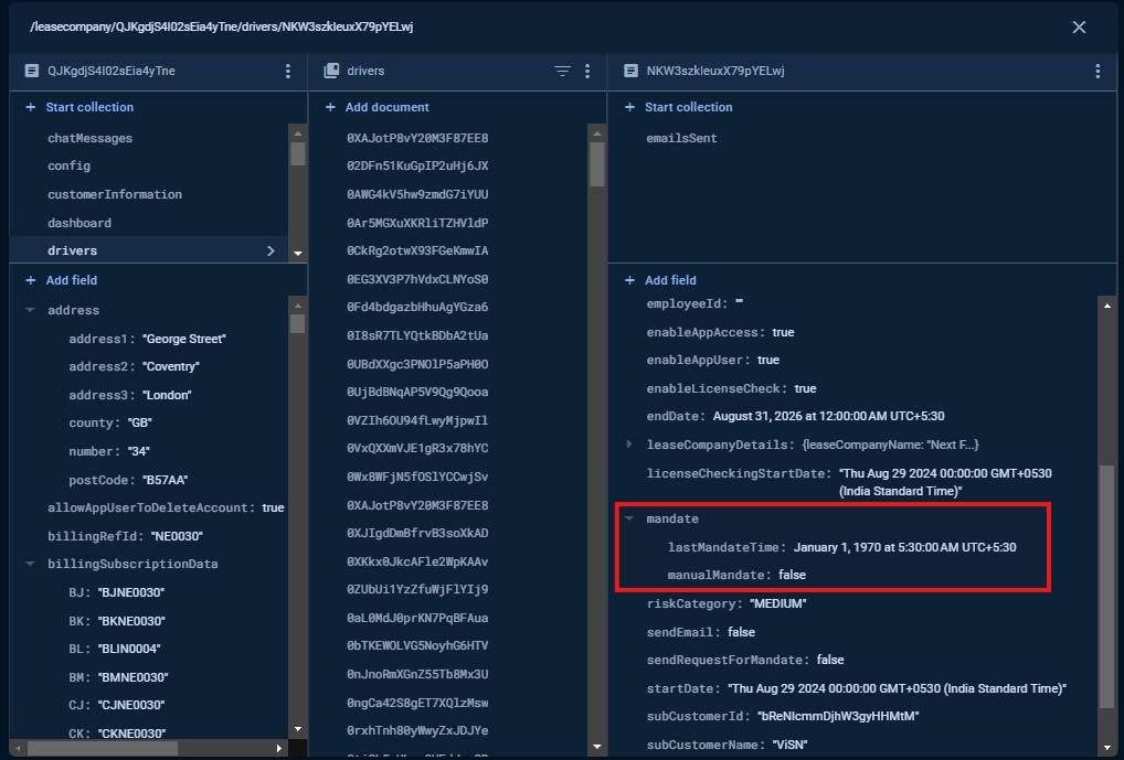 issueLicenseNumberMandateLogobject is created or updated with the current timestamp. - Confirm that the mandate object contains all required information to complete the Licence Number Collection Mandate.