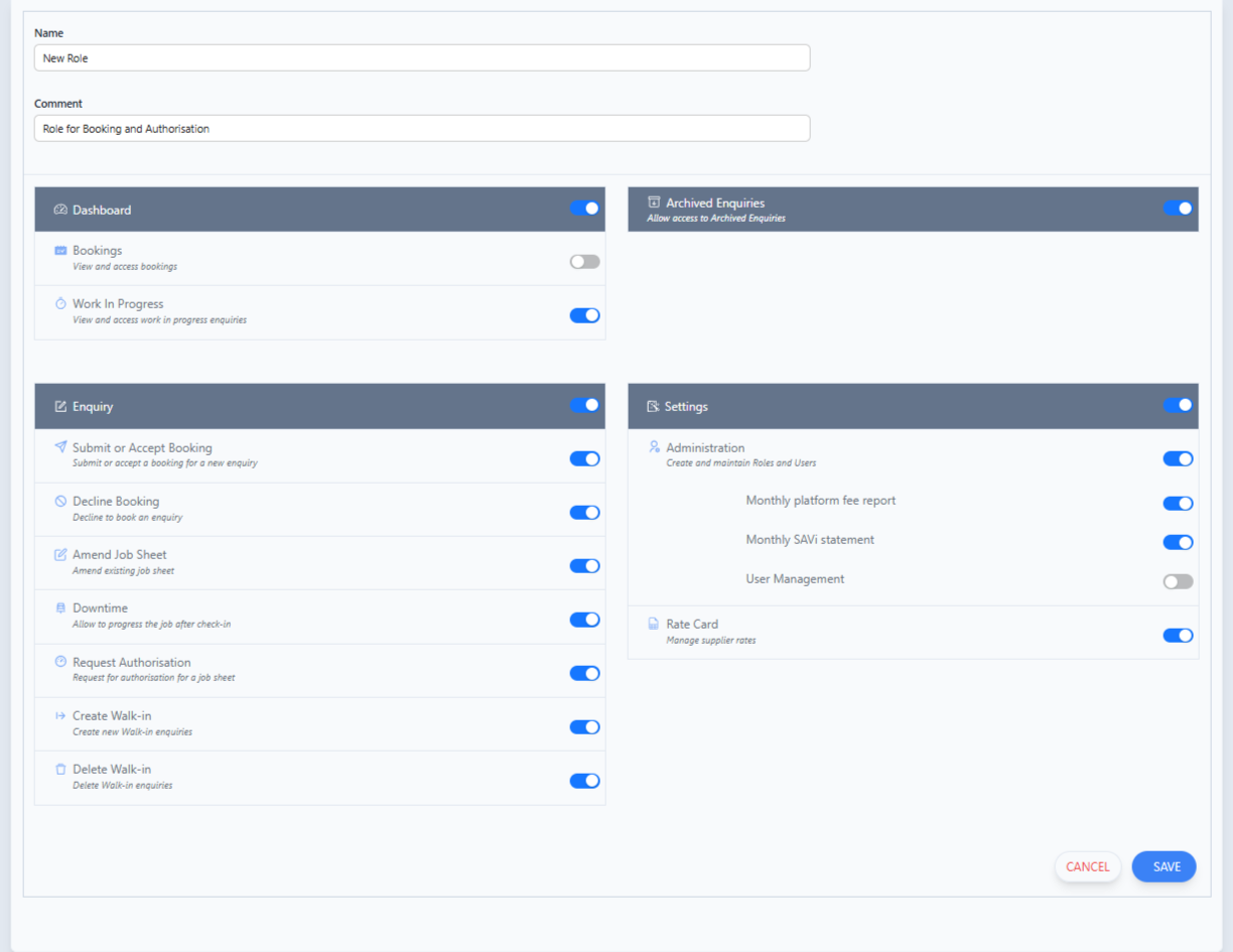 Manages access to enquiry operations including booking submission, acceptance, decline, job sheet amendments, and walk-in management. This category can be toggled on/off.